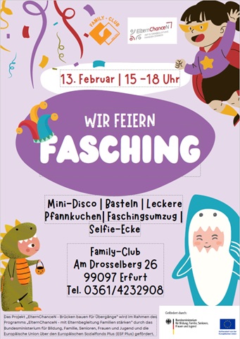 Am 13.02.2026 ist es endlich wieder soweit! Fasching für die ganze Familie mit lustigen Kostümen, leckeren Pfannkuchen, Disco mit Spielen und vielem mehr.